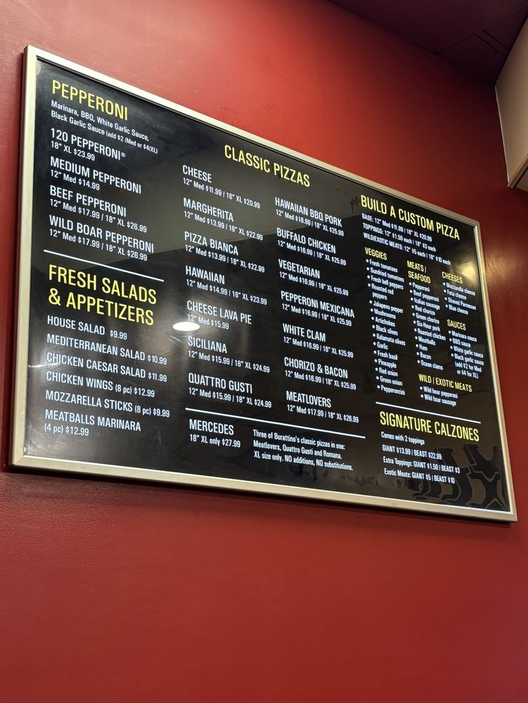Three of Burattino's classic pizzas in one: Meatlovers, Quattro Gusti, and Romana.